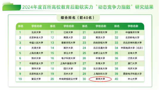 (转载自贵大新闻网)近日,由中国教育后勤协会推出的“2024年度百所高校后勤服务软实力动态竞争力指数”在北京大学正式发布。在此次发布的指数排名中,贵州大学以综合排名第30位的成绩跻身前列,创下该指数自2021年发布以来的最佳排名。